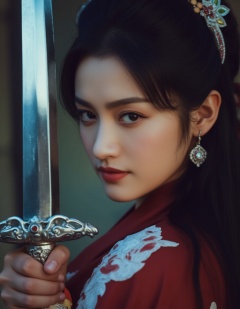 The image depicts a close-up of a woman holding a sword. She has long,dark hair adorned with intricate jewelry,including a headpiece and earrings. Her attire appears to be a red garment with floral patterns. The sword she holds is ornate,with a silver hilt and a blade that reflects light,giving it a shiny appearance. The background is blurred,focusing attention on the woman and her sword.,