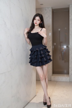 The image shows a woman leaning against a wall in a modern, well-lit room. She is wearing a black sleeveless top and a dark, ruffled skirt. Her hair is long and wavy, and she is barefoot, standing on the floor. The background features a marble wall with a glass door, and the room appears to be part of a bathroom or a similar setting. The woman is positioned in a way that suggests she is posing for the camera.