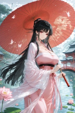 <lora:古风混合002:1>,1girl,umbrella,solo,long hair,black hair,breasts,flower,hanfu,earrings,holding umbrella,jewelry,holding,lily pad,oil-paper umbrella,bridge,chinese clothes,large breasts,looking at viewer,architecture,lotus,dress,outdoors,east asian architecture,long sleeves,smile,butterfly,cleavage,bug,closed mouth,bangs,water,