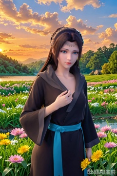 score_9_up,1girl, Black Robe,solo, long hair, black hair, outdoors, blue sky, cloud, wide sleeves, flowers,lawn,lake, sunset,hood,black robe,YunYun