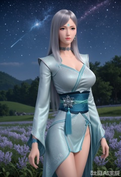 (in a meadow:1.3),(night:1.2),(stars:1.3),((perfect legs:1.2)),(large breasts:1.2),