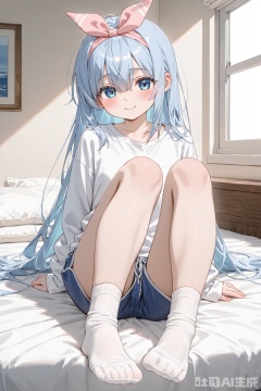 Gentle, shy, high-definition image, masterpiece, highest quality, shirt, window, long hair, safe for work, white shirt, blue shorts, shorts, indoors, 1 girl, sitting, eyebrows visible through hair, solo, blue eyes, blush, looking at viewer, original, bed, blue hair, very long hair, long sleeves, blue eyes, point of view eye contact, hair between eyes, smile, bangs, white shirt, closed mouth, bed, hairband, 1 other, indoors, hairband on head, short pants, white socks, long legs, cute girl, (little feet: 1.5)