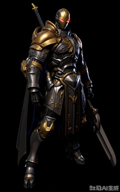 CDJS, 3D next-gen character photo of a robotic knight standing proudly, encased in a massive, medieval-inspired armored suit with gold and black plating. The suit has ornate carvings and a large, energy-charged sword strapped to its back. The knight's head is a featureless, glowing visor with a red hue, and its mechanical limbs are jointed with precision. The background is a deep black, making the knight's imposing figure stand out like a statue. The lighting is soft yet dramatic, highlighting the armor's intricate details and the knight's regal bearing. The overall mood is noble and imposing.
