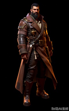 CDJS, 3D next-gen character photo of a futuristic pirate captain standing confidently, wearing a weathered, yet stylish, armored coat with brown and gold accents. The coat has multiple pockets and a large, belt-mounted holster for a pistol. The captain has a long, black beard and a fierce, determined expression. Their boots are heavy and leather, with spurs that jingle softly. The background is a simple black, allowing the captain's rugged charm to shine through. The lighting is warm, casting a golden glow on the coat and highlighting the captain's features. The overall mood is daring and adventurous.