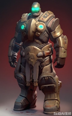 CDJS, 3D next-gen character photo of a robotic gladiator standing defiantly, encased in a massive, armored suit with bronze and gold plating. The suit has a rugged, battle-worn appearance, with dents and scratches that tell tales of past battles. The gladiator's head is a featureless, glowing visor with a red hue, and its mechanical limbs are jointed with strength. The background is a simple black, making the gladiator's imposing figure stand out like a colossus. The lighting is harsh, creating deep shadows that highlight its fearsome features. The overall mood is brutal and unyielding.