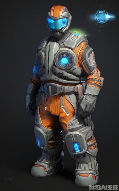 CDJS, 3D next-gen character photo of a high-tech bounty hunter standing alert, dressed in a sleek, armored jumpsuit with orange and black stripes. The jumpsuit has a built-in exoskeleton that enhances the hunter's strength and agility, and their helmet has a heads-up display that shows various data. The hunter's face is hidden behind a visor, but their sharp, blue eyes can be seen through it. The background is a solid black, emphasizing the hunter's futuristic appearance. The lighting is focused, highlighting the jumpsuit's details and creating a sense of urgency. The overall mood is focused and determined.