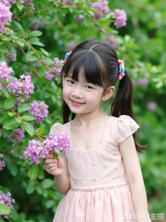 Character: A little girl with a playful single ponytail, her hair is black and smooth, and her hair is covered with cute blue and pink hair accessories. Wearing a light pink mesh puff sleeve dress, the light gauze and exquisite sequins embellish, it shows her innocence. She leaned slightly beside the crape myrtle branch, with a sweet smile on the corner of her mouth, her eyes clear and bright, conveying the innocent childlike fun.