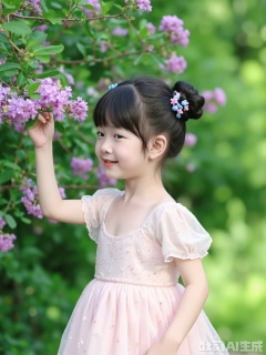 Character: A little girl with a playful single ponytail, her hair is black and smooth, and her hair is covered with cute blue and pink hair accessories. Wearing a light pink mesh puff sleeve dress, the light gauze and exquisite sequins embellish, it shows her innocence. She leaned slightly beside the crape myrtle branch, with a sweet smile on the corner of her mouth, her eyes clear and bright, conveying the innocent childlike fun.