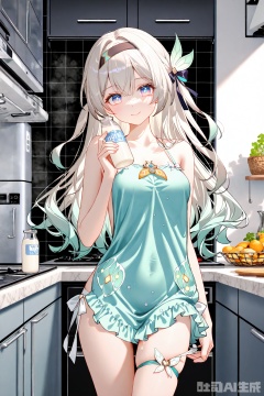 masterpiece, Ultra-high resolution, high quality, extremely detailed CG unity 8k wallpaper, extremely detailed, anime style, cover art, //, (chen bin:0.5),konya666,(hiten \(hitenkei\):0.4),(rimuu:0.5),(mignon:0.5),(sheya:0.6),[iumu], //, extreme aesthetic,(wlop:0.6),masterpiece,best quality,good quality,newest,very aesthetic,absurdres,Visual impact,32K UHD,sharp focus,(mogumo:1.1),(good hands, nice hands:0.5),impactful picture,offcial art,Smile, thighs 1girl, solo,looking at viewer, smile,Light blue home clothes, made of silk material, protruding from the thighs and shoulders, Leakage of thigh,holding a milk bottle in hand, in the kitchen, refrigerator, kitchenware,,firefly \(honkai: star rail\), long hair, black hairband, , grey hair, multicolored eyes,