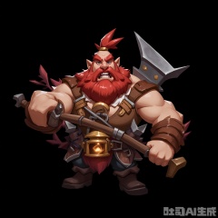 OMHT, A dynamic digital illustration of a boisterous dwarf with a bushy red beard, clad in a heavy leather vest and a pair of sturdy boots. He wields a large, double-headed axe in his right hand and has a belt full of mining tools around his waist. His face is full of determination, and a small, glowing lantern hangs from his belt. The background is a simple black, emphasizing the dwarf's rugged appearance. The style is cartoonish and full of strength.