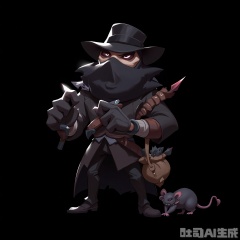 OMHT, A spirited digital illustration of a cunning thief with a mask covering his face and a sleek, black suit, wearing a pair of gloves with fingerless ends. He holds a lockpick in his right hand and has a small, leather pouch filled with stolen goods at his side. His eyes dart around suspiciously, and a small, black rat scurries beside him. The background is a simple black, highlighting the thief's stealthy nature. The style is cartoonish and full of suspense.