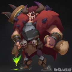 OMHT, A digital illustration of a towering, armored ogre character carrying a massive club, set against a black background. The ogre has a green and brown color scheme, with a large, glowing red eye patch covering one eye. They are accompanied by two small, purple, bat-like creatures hanging from their ears. The ogre is dressed in a tattered fur cloak with a metal breastplate and a pair of large boots, and they hold the club in their right hand. The club has a rough wooden head with spikes and a thick handle. The overall art style is brutish and imposing, with a monstrous fantasy theme.