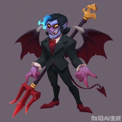 OMHT, A lively digital illustration of a mischievous imp with small, bat-like wings and a pointy tail, wearing a red and black suit. It holds a small, forked trident in its right hand and has a smirk on its face. Its eyes glow red, and a tiny, black cat follows closely behind. The background is a simple black, highlighting the imp's devilish charm. The style is cartoonish and full of mischief.