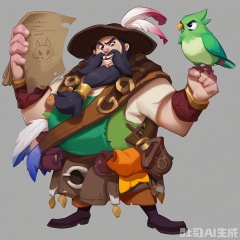 OMHT, A vibrant digital illustration of a cheerful bard with a long, flowing beard and a twinkle in his eye, wearing a colorful tunic and a hat with feathers. He holds a lute in his right hand and has a songbook in his left. His face is full of joy as he plays, and a small, green bird sings along. The background is a plain black, making the bard's lively performance stand out. The style is whimsical and musical.