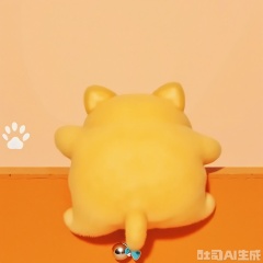 BYTX, A cute, orange kitten plush toy is curled up in a ball on a soft, orange fleece blanket. The kitten has round, green eyes, a tiny pink nose, and a fluffy tail. It's wearing a small, blue collar with a silver bell. The background is a peach-colored wall with a small, white paw print decal in the bottom left corner. The lighting is soft and warm, making the scene feel inviting and sweet.