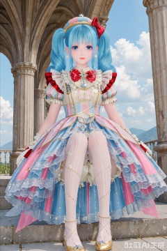 1girl, solo, long hair, looking at viewer, bangs, blue eyes, gloves, hat, dress, bow, twintails, jewelry, closed mouth, underwear, blue hair, standing, short sleeves, hair bow, pantyhose, earrings, frills, sky, striped, puffy sleeves, cloud, red bow, puffy short sleeves, drill hair, gem, multicolored clothes, vertical stripes,bloomers, pearl \(gemstone\),sitting,feet,long_legs