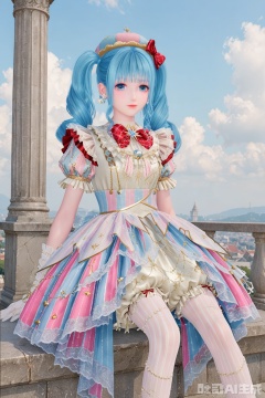 1girl, solo, long hair, looking at viewer, bangs, blue eyes, gloves, hat, dress, bow, twintails, jewelry, closed mouth, underwear, blue hair, standing, short sleeves, hair bow, pantyhose, earrings, frills, sky, striped, puffy sleeves, cloud, red bow, puffy short sleeves, drill hair, gem, multicolored clothes, vertical stripes,bloomers, pearl \(gemstone\),sitting,feet,long_legs