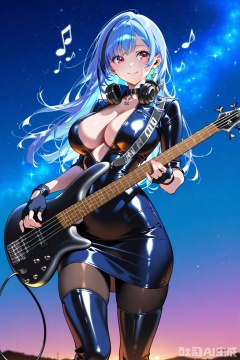 (1woman playing bass guitar),solo,big breasts,smile,beautiful eyes,cool tone colour hair,streaked long hair,glossy leather Open collar unzipped cutouts on sides evening dress,fingerless gloves,lovestruck,headphone on neck,pantyhose,thigh boots,musical notes,outdoor,starry sky,textures,detailed texture,very detailed face,masterpiece,best quality,good quality,very awa,very aesthetic,absurdres,newest,