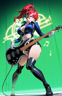 (1woman playing bass guitar),solo,front angle,dynamic pose,big breasts,beautiful eyes,streaked hair,long ponytail,glossy black leather long Sleeve,Open collar,bare hip unzipped cutouts on sides crop top,very short,leather shorts,white gloves,lovestruck,headphone,thighboots,musical notes,cyberpunk background,on stage,full body,textures,detailed texture,very detailed face,masterpiece,best quality,good quality,very aesthetic,absurdres,newest,artist:yoneyama mai,<lora:SR300E X20A5:1>,
