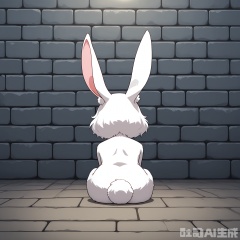 BYTX, A cute, fluffy white rabbit with long ears and pink inner ears is sitting on a blue tiled floor, facing away from the viewer. The rabbit is positioned near a stone wall with a rough texture. The lighting is soft and natural, casting gentle shadows. The rabbit's fur appears soft and plush. The image is a high-quality digital illustration with a whimsical and serene atmosphere. The rabbit's tail is visible, and it is the main focus of the composition.