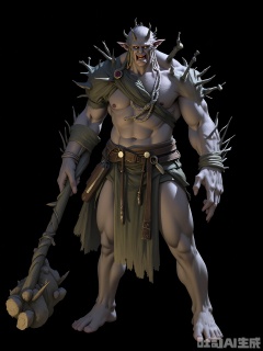 HTJS, A game design thick-painted character of a monstrous, ogre-like creature with rough, gray skin and a hulking frame. Its eyes are small and beady, and its mouth is filled with sharp, jagged teeth. It wears a tattered loincloth and carries a massive, wooden club with nails protruding from it. Standing against a black background, it looks like a force of destruction.