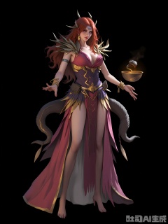 HTJS, A digital painting of a woman with long red hair, wearing a flowing pink and purple dress adorned with gold accents. She has a slender physique and is holding a bowl of water in one hand, with a snake emerging from it. Her expression is calm and confident, and she is standing against a black background. The artwork has a fantasy theme, with intricate details in the clothing and accessories. The style is reminiscent of concept art from video games or fantasy novels.