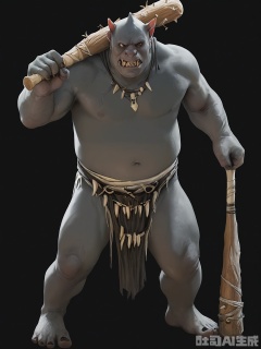 HTJS, A game design thick-painted character of a monstrous, ogre-like creature with rough, gray skin and a hulking frame. Its eyes are small and beady, and its mouth is filled with sharp, jagged teeth. It wears a tattered loincloth and carries a massive, wooden club with nails protruding from it. Standing against a black background, it looks like a force of destruction.
