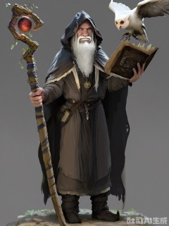 HTJS, A detailed digital painting of a rugged, old wizard with a long white beard, wearing a tattered brown robe and a hooded cloak. He holds a staff with a white owl perched on top, and a book in his other hand. The background is plain gray. The wizard has a wise and mysterious expression, and the artwork is highly detailed and realistic. The style is fantasy art with a focus on texture and intricate details.