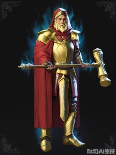 HTJS, A game design thick-painted illustration of a noble, male paladin with a short, blond beard and a kind but determined expression. His white and gold plate armor is adorned with religious symbols, and he carries a large, two-handed hammer with a holy engraving. A red cape billows behind him as he stands against a black background, radiating an aura of righteousness.