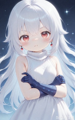 aged down,loli,loli,loli,female child,little girl,petite,1girl, solo, long hair, breasts, looking at viewer, blush, hair between eyes, bare shoulders, closed mouth, upper body, small breasts,sleeveless, alternate costume, sweater, v-shaped eyebrows, bare arms, turtleneck, crossed arms, :t, turtleneck sweater, pout, white sweater, =3, sleeveless sweater, hair ornament, red eyes,gloves, dress, hair between eyes, bare shoulders, jewelry, very long hair,white hair, earrings,elbow gloves, armpits,white dress,floating hair, floating, blue gloves,starry gloves,cxskirk