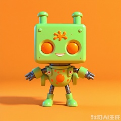 JQR, A 3D CGI illustration of a quirky, anthropomorphic iron robot with a lime green and orange color scheme. It stands against a pale orange background. The robot has a boxy head with two large, orange eyes that seem to wink and a small, lime green antenna that bends. Its body is covered in small, orange polka dots and has a lime green backpack. It has two short, lime green iron arms that can shoot out confetti. The cheerful orange background gives it a fun and festive look.