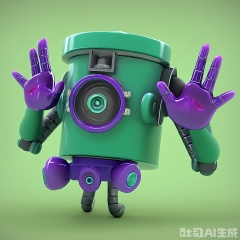 JQR, A 3D CGI render of a quirky, anthropomorphic iron robot with a purple and green color scheme. It's set against a light mint green background. The robot has a boxy head with two large, green eyes that seem to pop out and a small, purple mouth that's always in a surprised expression. Its body is covered in small, purple gears that rotate slowly. It has two short, green iron arms with suction cups on the palms. The light green background gives it a fun and quirky feel