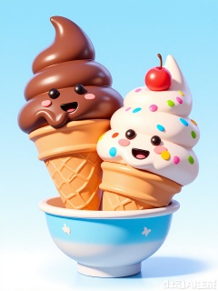 DSSJ, A digital 3D illustration featuring two joyful, smiling ice cream cones in a bowl. The bigger cone has chocolate ice cream with a cherry on top and a big smile, while the smaller one has vanilla ice cream with sprinkles, also smiling. Both have a crispy cone base. The background is a gradient of pastel blue and light pink, like a summer day. The style is sweet and playful, giving off a refreshing and inviting vibe. The ice cream cones have a cute, edible design that makes you crave a treat.