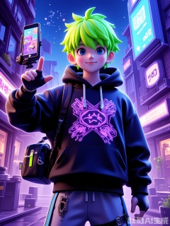 DSSJ, A digital illustration of a young man with short, neon-green hair spiked up, wearing a black hoodie with a glowing purple circuit pattern and gray joggers. He is recording a video in a neon-lit cyberpunk alleyway filled with holographic advertisements and flickering streetlights. He has a silver chain necklace, black fingerless gloves, and a black backpack with neon-blue stripes. He is giving a thumbs-up with his right hand and has a confident, energetic expression. The lighting is a mix of bright neon colors and deep shadows, emphasizing the gritty yet futuristic atmosphere.