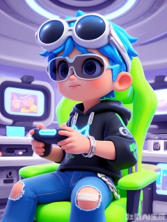 DSSJ, A young man with spiky, electric blue hair, wearing angular, geometric-shaped silver sunglasses, a black graphic hoodie with a neon-green alien design, and ripped light-wash jeans. He has a silver chain bracelet and is holding a holographic controller in one hand, sitting on a futuristic, glowing blue gaming chair. The background is a neon-lit virtual reality gaming room with floating digital elements. The style is 3D poster, with a bold and futuristic aesthetic.