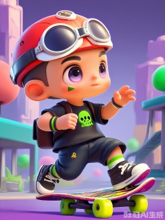 DSSJ, 3D render, anime style, young boy with a buzz cut and a red mohawk on top, wearing a black skateboarding helmet with neon-green stripes, a black graphic T-shirt with a skull design, baggy black jeans with knee holes, black skate shoes, holding a skateboard with a dragon graphic under his left arm, a small black backpack with skateboard stickers on it, a skate park background with ramps and rails, daring expression, big intense eyes, soft shading, digital art, medium shot, skateboarding-inspired casual wear.