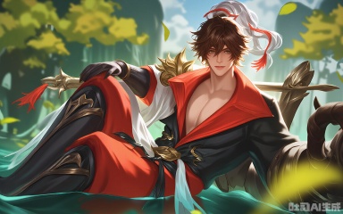 ZSHT, A digital painting of a male character from the game Genshin Impact, Liyue's Zhongli, sitting in a lotus position on the ground, surrounded by water and trees. He has long brown hair with a white and red topknot, and he is wearing a red and white outfit with black thigh-high boots. His expression is calm and confident. The background features a serene, natural setting with greenery and a clear sky. The art style is detailed and vibrant, with a focus on the character's design and the peaceful atmosphere.