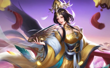 ZSHT, A digital painting of a beautiful woman with long, flowing dark hair, wearing a detailed and ornate golden and white dress adorned with feathers and jewels. She has a serene expression and is holding a delicate, feathered fan in her right hand. The background features a soft, gradient sky with pink and purple hues, and a traditional Asian-style building with intricate architecture in the distance. The woman's attire includes a feathered headdress and a decorative belt with a large, ornate buckle. The overall style is reminiscent of Chinese mythology and fantasy art.