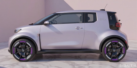 CYCX, A futuristic, small electric hatchback with a minimalist design, featuring a compact, rounded body in a glossy lavender. The hatchback has a small front grille, large, expressive headlights, and black alloy wheels with purple accents. It has a panoramic sunroof and a small, rear spoiler. Positioned on a smooth, white marble floor, with a plain pastel pink wall in the background, the CGI image emphasizes the hatchback's playful and modern style.