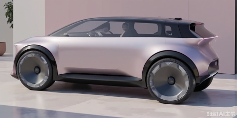 CYCX, A futuristic, small electric hatchback with a minimalist design, featuring a compact, rounded body in a glossy lavender. The hatchback has a small front grille, large, expressive headlights, and black alloy wheels with purple accents. It has a panoramic sunroof and a small, rear spoiler. Positioned on a smooth, white marble floor, with a plain pastel pink wall in the background, the CGI image emphasizes the hatchback's playful and modern style.