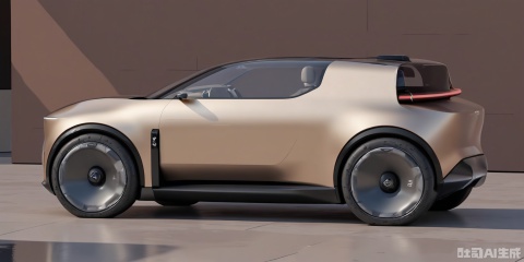 CYCX, A futuristic, small electric convertible with a minimalist design, featuring a soft-top, two-seater body in a metallic gold. The convertible has a sleek, aerodynamic shape, a low-profile windshield, and black wire wheels. It has a small, removable hardtop that can be stored in the trunk. Positioned on a reflective, gold-tinted glass floor, with a plain dark brown wall in the background, the CGI image emphasizes the convertible's luxury and freedom.