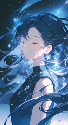 1girl, solo, long hair, jewelry, blue hair, closed eyes, upper body, earrings, parted lips, sleeveless, star \(symbol\), floating hair, blue theme   ,Light, shadow