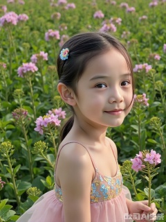 Character: The little girl with a single ponytail, her hair is covered with gold powder by the sun, and the blue vermicelli stripes of her hair accessories turn into a flowing rainbow in the light and shadow. The light pink mesh skirt wraps the body like a cloud, and the sequins tremble slightly with breathing, as if they are hiding the tiny starlight. She relies on flowers, her side face is softened by petals, her eyes are clear ponds without dust, and the smile on the corners of her mouth is filled with gentle arcs, weaving the poetry of innocence and nature.