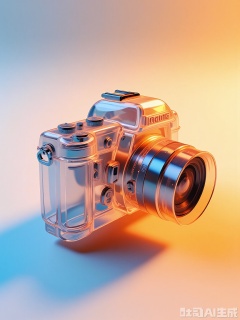 JBTM, A high-quality 3D image of a vintage, transparent glass camera with a bellows, set against a gradient background changing from light gray at the top to soft beige at the bottom. The camera is centered, facing slightly to the left, with a polished glass surface that reflects the light. Its design is classic and nostalgic, featuring a foldable bellows and a viewfinder. The lighting is warm and inviting, creating a nostalgic photography environment around the camera. The overall aesthetic is charming and retro, highlighting the camera's vintage charm and practicality.