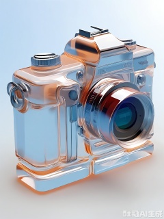 JBTM, A high-quality 3D image of a vintage, transparent glass camera with a bellows, set against a gradient background changing from light gray at the top to soft beige at the bottom. The camera is centered, facing slightly to the left, with a polished glass surface that reflects the light. Its design is classic and nostalgic, featuring a foldable bellows and a viewfinder. The lighting is warm and inviting, creating a nostalgic photography environment around the camera. The overall aesthetic is charming and retro, highlighting the camera's vintage charm and practicality.