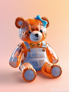 JBTM, A high-quality 3D visualization of a playful, transparent glass teddy bear with a bow, resting on a gradient background shifting from light orange at the top to soft pink at the bottom. The teddy bear is positioned centrally, tilted slightly to the right, with a smooth glass surface that shows the bear's features inside. Its design is cute and whimsical, featuring a round body and a friendly face. The lighting is soft and cheerful, creating a happy atmosphere around the teddy bear. The overall look is endearing and inviting, emphasizing the teddy bear's playful design and the warmth of companionship.