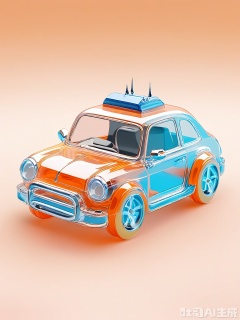 JBTM, A high-quality 3D visualization of a playful, transparent glass toy car with wheels, resting on a gradient background shifting from light orange at the top to soft yellow at the bottom. The toy car is positioned centrally, tilted slightly to the right, with a smooth glass surface that shows the wheels inside. Its design is cute and whimsical, featuring a rounded body and a driver's seat. The lighting is soft and cheerful, creating a happy atmosphere around the toy car. The overall look is endearing and inviting, emphasizing the toy car's playful design and the joy of play.