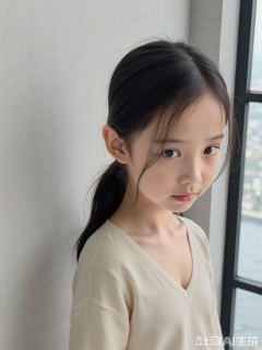 Character: The little girl tied her ponytail with a neat ponytail, and her black hair naturally hangs down, and a few strands of hair gently brushed her cheeks, adding a little bit of agility. Wearing a light beige V-neck plain dress, she fits her body without showing restraint, showing her innocent purity. She stood quietly, her eyes clear and bright, as if she had little thoughts hidden without sayings, and her lips were slightly pursed, conveying unmodified innocence and indifference.