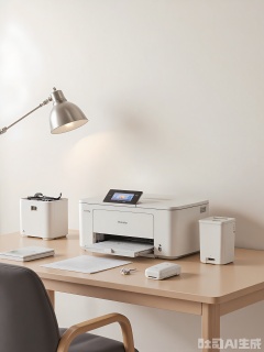 JDHB, Photograph of a minimalist home office with a compact printer and scanner. A wireless all-in-one printer with a sleek design and touchscreen display sits on a desk. A document scanner with high-speed scanning capabilities is integrated, and a paper shredder sits nearby for secure disposal. The desk is made of light wood with a matte finish, and a comfortable office chair completes the workspace. The lighting is bright and focused, with a desk lamp providing additional illumination.