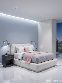 JDHB, A minimalist bedroom with a modern design, featuring a platform bed with a light gray and white bedspread, a black bedside table, and a pink throw pillow. The background includes a pale blue wall and a large window with a view of a starry night sky. The bedroom has a sleek, contemporary aesthetic with white and chrome accents. The lighting is dimmable and cozy, highlighting the clean lines and serene atmosphere.